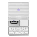 The laptop holder supports any laptop from 10” to 17”**; plus each device connects to multiple OS (Windows macOS iPadOS ChromeOS) via Bluetooth Low Energy. (Excludes tablet computers)